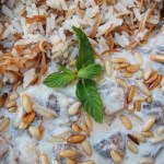 Kibbeh cooked in yogurt sauce and mixed with tarragon leaves. Served with a side of rice.